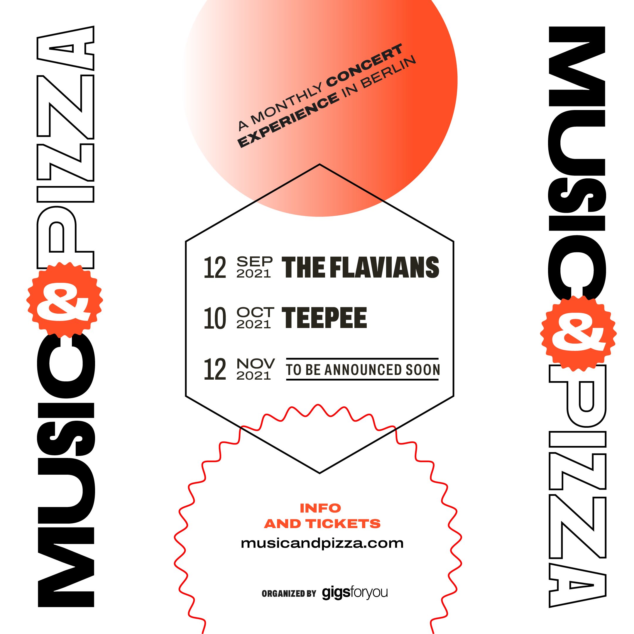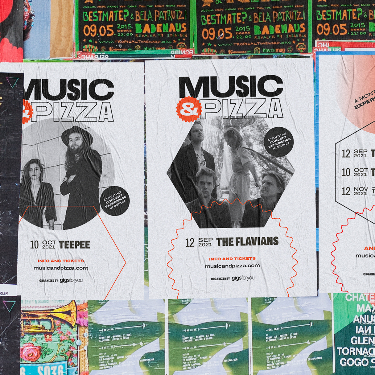 Music & Pizza was a brand created by Berlin-based promoter Gigsforyou to host intimate acoustic concerts with emerging bands, followed by a pizza party shared between artists and fans. The project’s full identity was developed, including the logo, social media animations, and event materials, capturing the warm and playful spirit of these live sessions.
